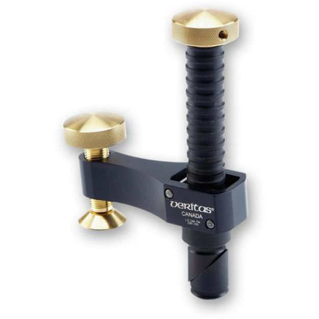 Hold down, bench clamp, surface clamp - the functions the same just the name changes but true to form Veritas have taken an ordinary thing and made it much, much better - as well as a thing of beauty in brass and black satin. These fast acting surface clamps can be used anywhere you can drill a 19 or 20mm diameter hole. The post has a wedging mechanism which anchors it firmly (horizontally or vertically) in material as thin as 16mm(5/8") provided it will resist the expansion of the wedge, making it the perfect companion for your jigs and sub-tables. The clamp arm slides easily for quick adjustment when tilted but locks firmly at 90°, with a reach of 54mm(2.1/8") it will also clamp up to a thickness of 95mm(3.3/4"). The combined forces of the wedge hold activated by the top screw, firm lock on the shaft ridges via steel pins and the generous clamp screw give you excellent hands free holding power.
